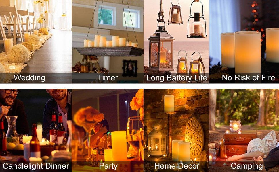 These flickering candles are made of real wax which gives them the appearance of regular candles. But they are safer than ordinary candles, because they are led lights that don't burn, but have the same effect as ordinary candles. An amber yellow glow is given out from these led pillar candles, which is perfect for the creation of atmosphere for Wedding and Home Decor. Just set them into your favorite wall sconces, lanterns, chandelier pumpkin, mantle over the fireplace or candle holder or mix with other decorations and table settings. They can be also used as a mood light in bathroom or on balcony. You even can put them on the floor and outline the road to your wedding. The effect is beyond magical!