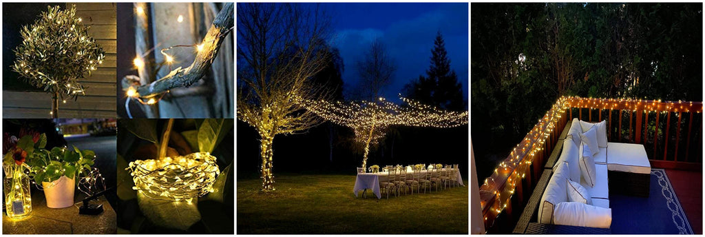 Our battery operated fairy lights with timer. Suitable for outdoor and indoor use. These indoor/outdoor lights string is made of soft silver-coated copper wire which can be easily bent, twisted and shaped in any room, making them perfect for bedrooms, display cabinets, walls, ceilings, windows, Christmas trees, and many other places. You even can weave them in flower beds, or put them on outdoor tables as part of your outdoor dining. They also have a remote control function, you can use it to adjust brightness, timer function, which means you can pop them in the perfect spot before setting to the timer for automatic glow at the same time each day. It's good to have a remote control to turn them off when you are already in bed.