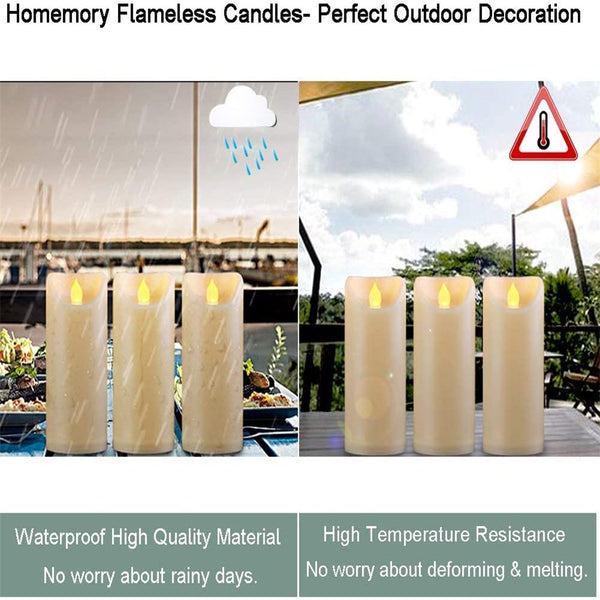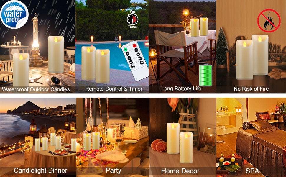 Useful Features: Waterproof: With swivel battery cover and sealed top, this set of outdoor flameless candles are completely waterproof so they can be used outside, even in rainy day. Realistic Material: The LED flameless candles are made of wax-like plastic. So it won’t deform or melt like wax candles in high temperature environment.