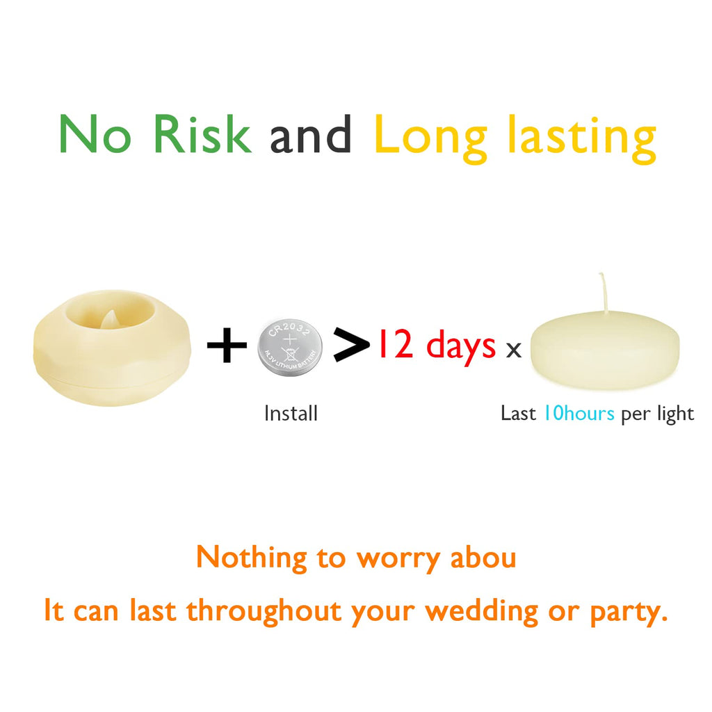 - π[ Safer in any setting ] our 3 inch battery floating candles can be used without having to worry of flame, absolutely No fire hazards or burning risks, No hot and dirty wax to deal with; safe for families with pet(s) or young child(ren)