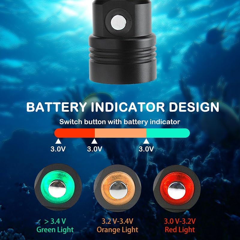 【Long-lasting Runtime】This dive headlamp with battery indicator(Green Light: >30%, Orange Light: 10%-30%, Red Light Flash: <10%) powered by 1 rechargeable battery(Equipped with 2 batteries). After fully charged(about 5.5 hours), the dive light provides 3.5 hours of runtime in high mode and 5.5 hours in low mode. 💌NOTE: The rear cover of the battery compartment must be tightened, otherwise the light will not turn on.