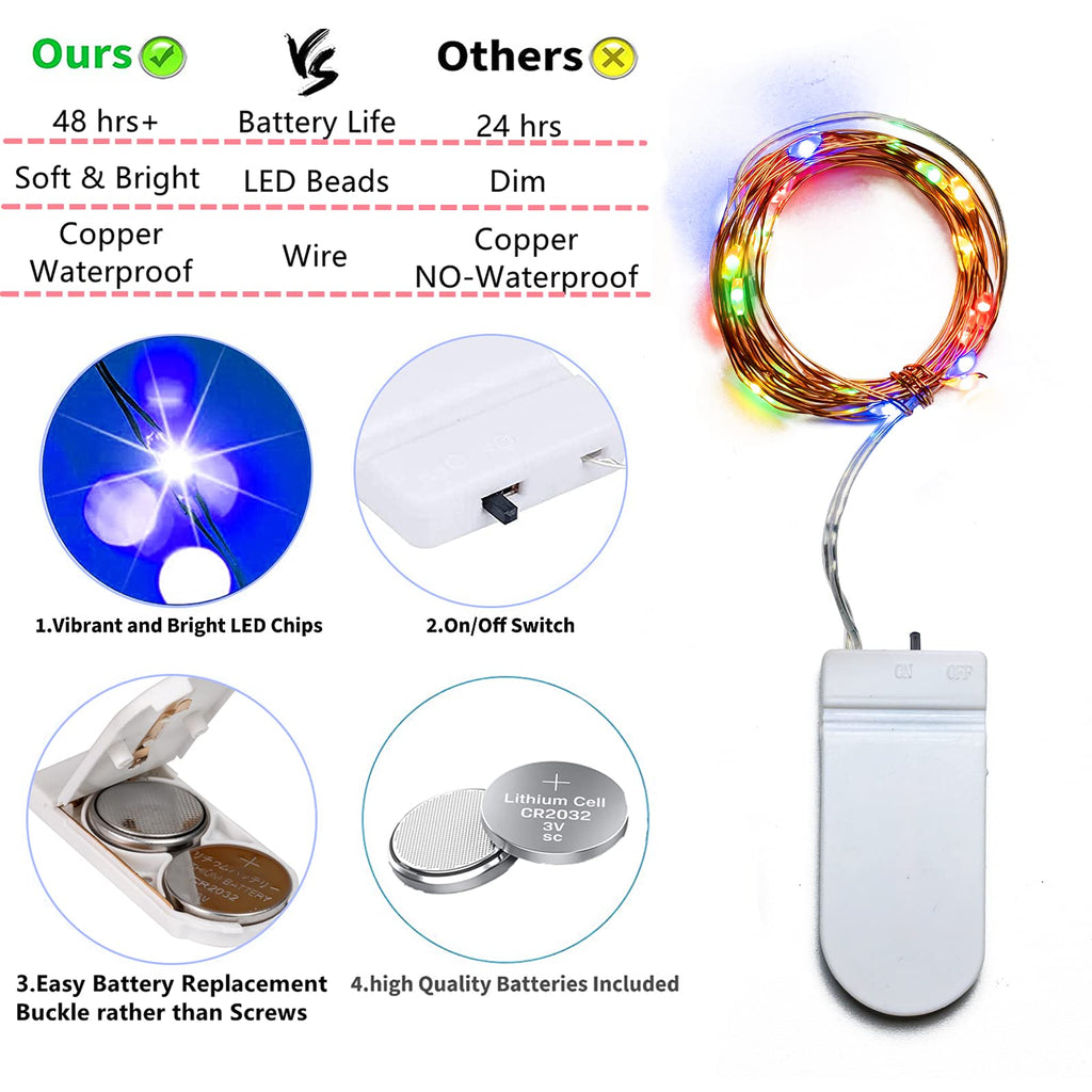 - Perfect Substitution---12 Pcs 6.6 ft Fairy String lights are completely better than 33 ft or 66 ft string lights, compared with their over-long size, bulky large battery box, and nightmarish twists and knots. The combination of the 6.6 ft Length + Thumb-sized battery box perfectly meets the consumers’ requirements for Simple operation and Hiding the battery box.