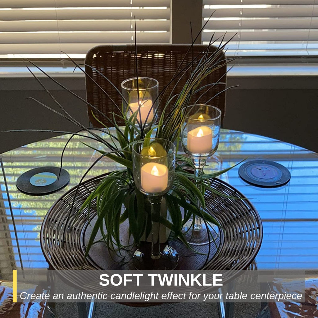 - USE THEM EVERYWHERE: Each electric tea light measures at (Dia)1.4''X (Height)1.25'', making it a perfect fit for most votive holders. Ideal for home decor, table centerpieces, Morrocan lamps, and Mason Jars, bring warmth and joy on the dark stormy night.