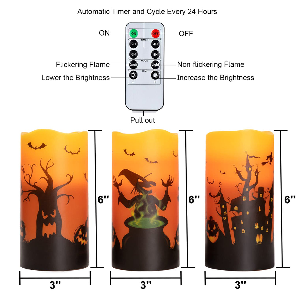 - Package Include: This Halloween Candle Set include three orange flameless pillar candles(D3"x H6"), 1x remote control, 1x user manual. Each candle is powered by 2 AA batteries(500+ hours with high-grade batteries). All these candles have been tested strictly by Homemory.