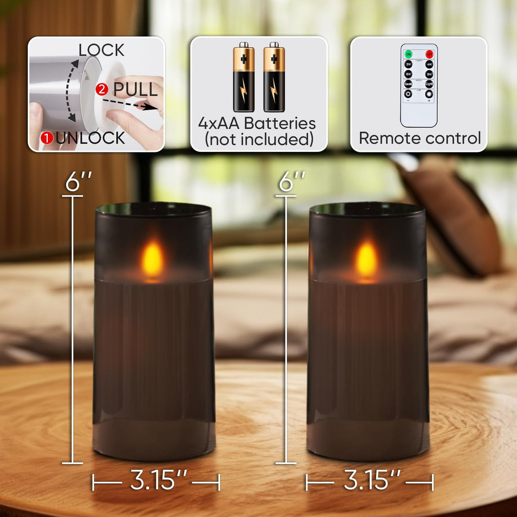 / Homemory Realistic Flickering Flameless Candles with Dancing Flame, LED Candles, Battery Operated Candles with Remote and Timers, Grey Acrylic, Outdoor Waterproof, 3.15"x6", Set of 2