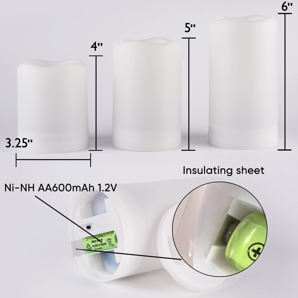 - Safe and Reliable Batteries: Each candle is equipped with a 1.2V Ni-MH AA rechargeable battery with 600 mAh large capacity, which is very safe, stable and reliable when used with solar charging board; even if the battery performance declines after a long period of use, it can be easily replaced by taking out the bottom cover (please do not replace it with ordinary batteries).