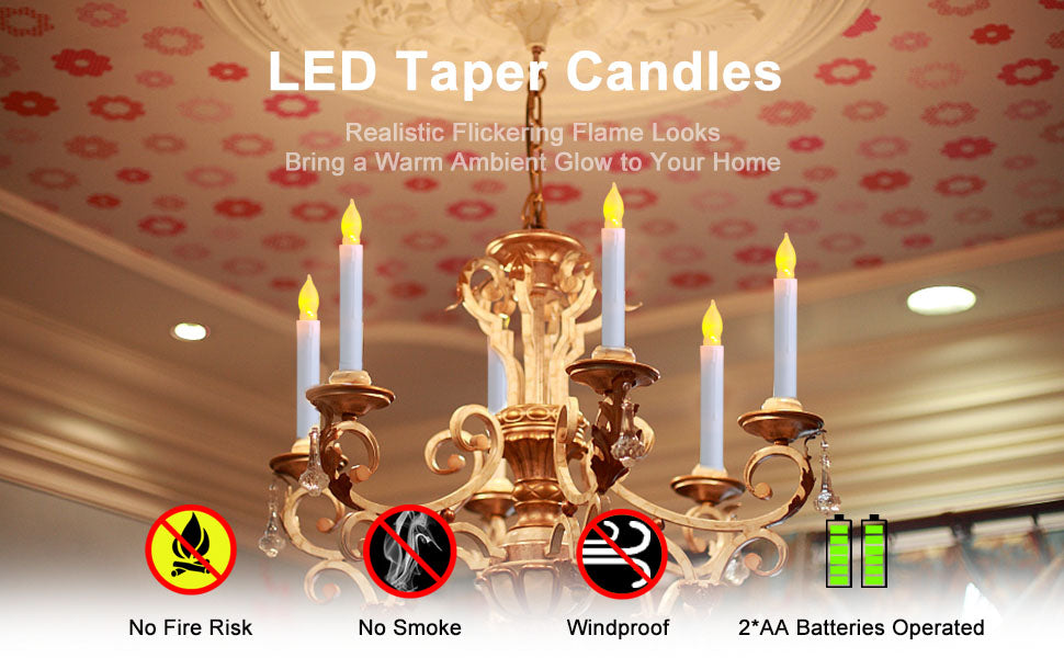 Instead of Traditional Candles: Traditional burning candles always with flames, smoke, and hot wax which are extremely dangerous. Homemory LED taper candles are made of high quality plastic. The battery operated flameless handheld candles not only with flickering light but also SAFE for use around kids, pets, furniture and draperies.