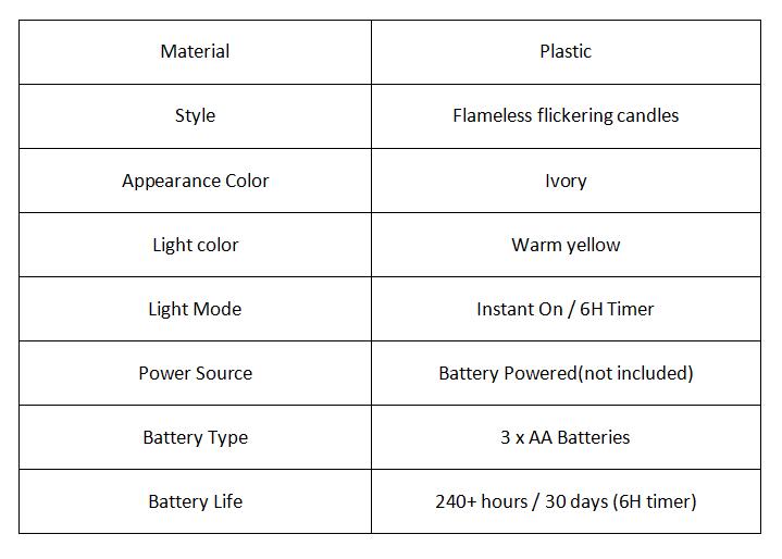 Bright and Long-Lasting: LED bulbs of the candles emit a bright warm yellow light, flickering slightly like natural candlelight. Each candle requires 3 x AA batteries (not included). Using advanced batteries, they can light up for 500+ hours(continuously on) / 60 days (6H timer with high-grade batteries).
