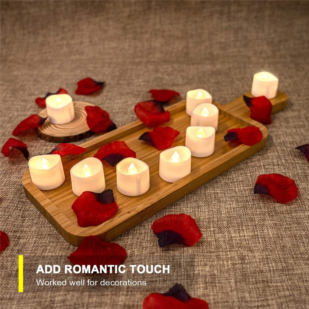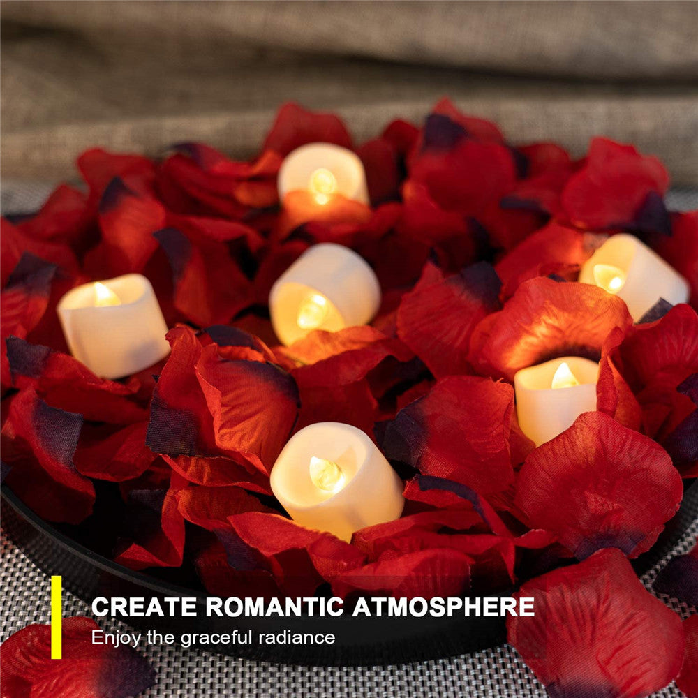 - Romantic choice with great bonus: Special set with 100pcs rose petals (artificial) that would be a great bonus. These rose petals can be used for decorative purposes and for further boosting the visual charisma of the flicker candles. An absolutely stunning yet cost-effective way to decorate on Wedding, Proposal, Anniversary or Honeymoon.