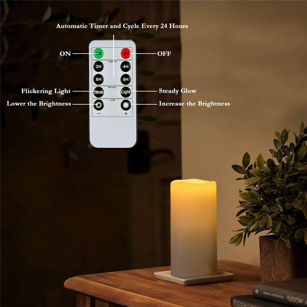 Easy to Use: The switch on the bottom allows you to turn the outdoor waterproof candles ON / OFF. The Remote Control provide a 2H/4H/6H/8H timer options, which will save your trouble to turn the timer candles on/off because they will come back on automatically at the same time every day. Also, you can adjust the light modes(flicker/steady glow) and brightness level as you want.